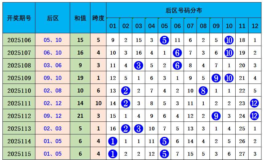 上期后区开出奖号01、05,奇偶比2:0,近10期奇偶比9:11,偶数奖号开出较热,本期推荐奇偶比1:1,参考后区号码07、08。