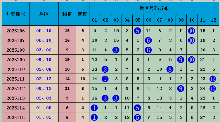 后区分析:上期后区开出01 05,和值6,较上期和值持平,本期预计和值会上升,看好号码10 12,和值22。