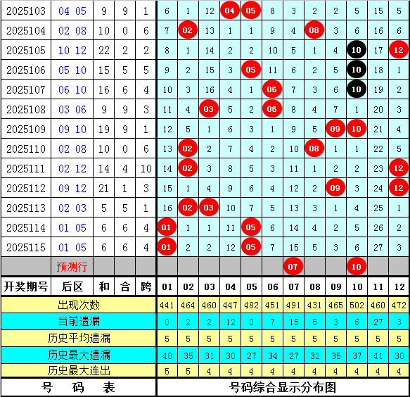 后区判断:上期后区奖号为01和05,开出热码+热码组合。最近十期后区开出11个热码、6个温码和3个冷码,本期预计奖号关注冷码+温码组合,参考两码07、10。