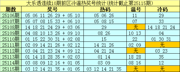 大乐透第25106期-第25115期前区奖号冷温热分布统计: