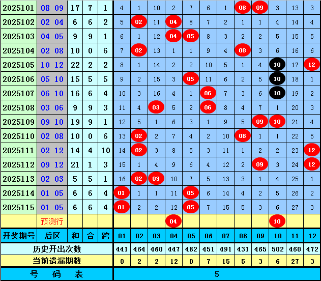 后区分析:上期后区开出奖号01和05,在最近50期开奖中,后区奖号012路落号比为33:35:32,前10期后区012路落号比为8:5:7,本期后区关注号码02、04、08、10、12,两码参考04、10。