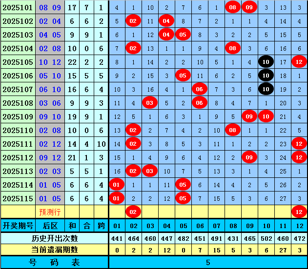后区分析【一区01-04,二区05-08,三区09-12】:上期后区奖号为01和05,分别落在第一、二区,近50期后区三区比为39:28:33,近10期三区比为7:6:7,本期注意第一、三区号码出现,关注两码02+12。
