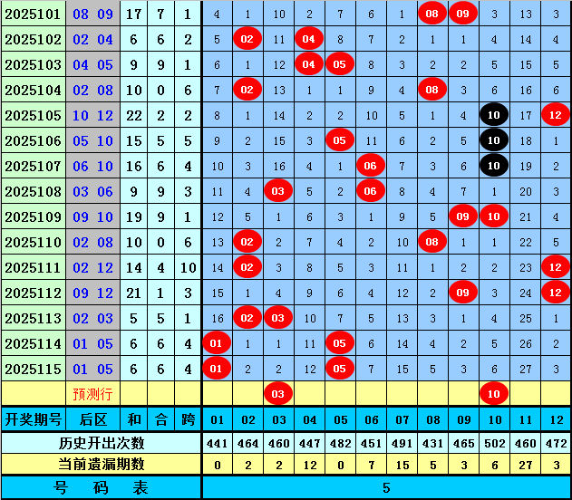 后区第二位推荐:在连续5期开奖中分别出号:12、12、03、05、05,均值为7.4,其中偶数奖号出现较少,本期适当关注偶数号码回补,参考号码10。