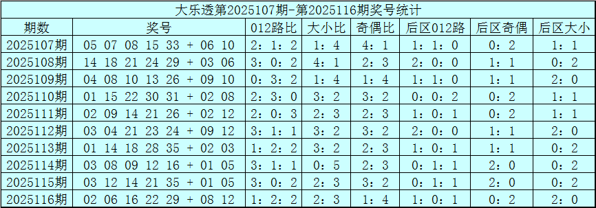 体彩大乐透第25116期奖号为:02 06 16 22 29+08 12,前区奖号012路比为1:2:2,奇偶比为1:4,大小比为2:3,后区1路号码轮空。