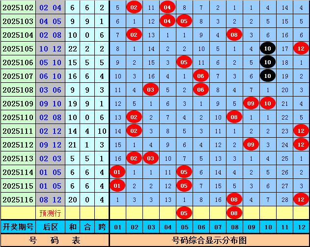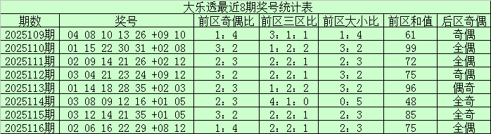 后区分析:上期开出后区奖号08+12,为全偶组合后区最近10期全奇、全偶和一奇一偶组合分别开出2次、4次和4次,本期后区关注一奇一偶组合,参考号码05、08。