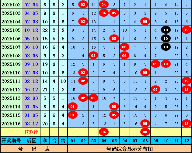 后区分析(一区01-04,二区05-08,三区09-12):上期后区开出奖号08和12,最近10期后区三区落号比为7:12:7,本期后区关注号码04、07、08、11、12,后区两码参考04、08。