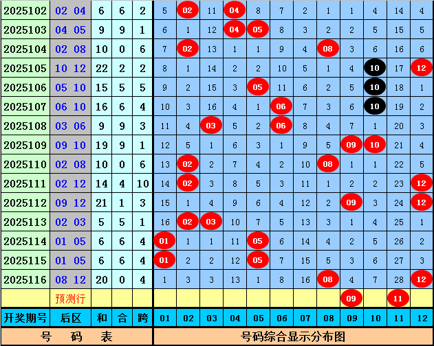 第2025116期大乐透奖号为02 06 16 22 29 + 08 12,其中前区号码奇偶比为1:4,大小比为2:3,012路比为1:2:2,后区号码和值为20,跨度为4。