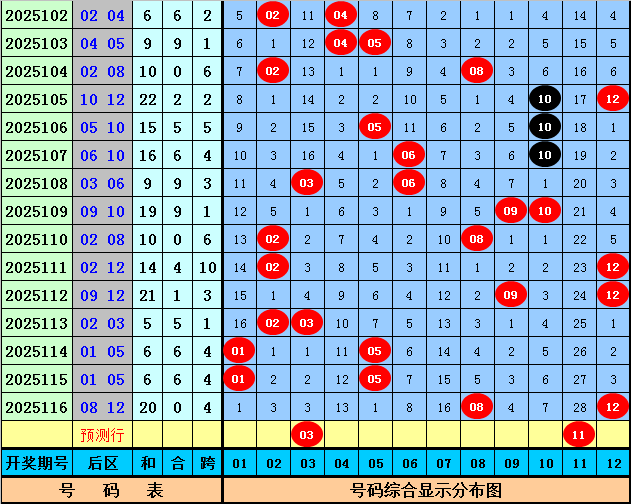 后区分析:上期后区开出2路+0路号08和12,最近30期后区奖号012路比为19:19:22,最近10期后区奖号012路比为9:4:7,本期后区注意号码01、03、05、10、11,单挑两码组合03、11。
