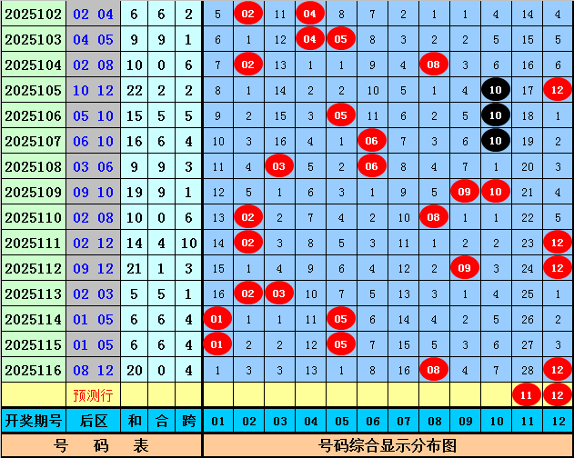 后区号码分析:在第117期历史同期开奖中奖,奖号08出现5次,奖号02 05 07 09 10出现4次,奖号03出现3次,奖号04 06出现2次,奖号11 12出现1次,奖号01没有出现。本期后区五码参考07、08、09、11、12。
