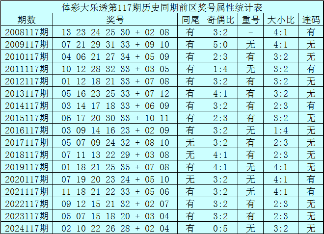 体彩大乐透第117期历史同期开出17次奖号,其统计详见下表:
