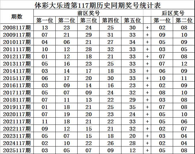 王守礼体彩大乐透第2025117期历史同期定位升重降号码分析: