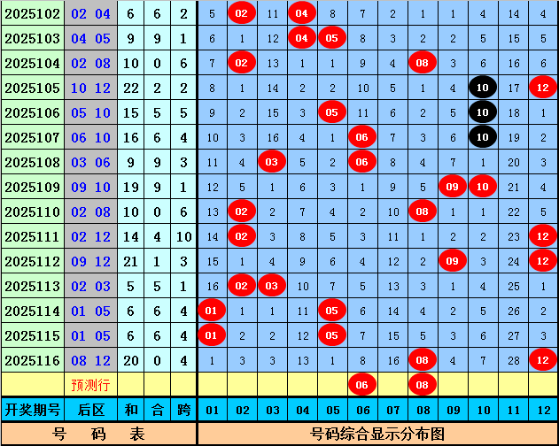 后区第一位分析:在第117期历史同期开奖中,该位号码升重降次数比为6:2:8,出现范围在02-10区间,最近5年后区第一位号码升重降次数比为1:1:3,出现范围在02-05,对比最近几年同期号码,今年第117期看好后区第一位号码逐渐上升,关注号码06。