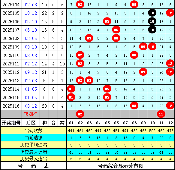 上期回顾:体彩大乐透第2025116期开出号码:02 06 16 22 29 + 08 12,其中前区奖号尾数奇偶比为1:4,大小比为3:2,012路比为3:0:2,大中小比为1:2:2,后区奖号尾数奇偶比为0:2,大小比为1:1。
