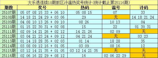 大乐透第25107期-第25116期前区奖号冷温热分布统计: