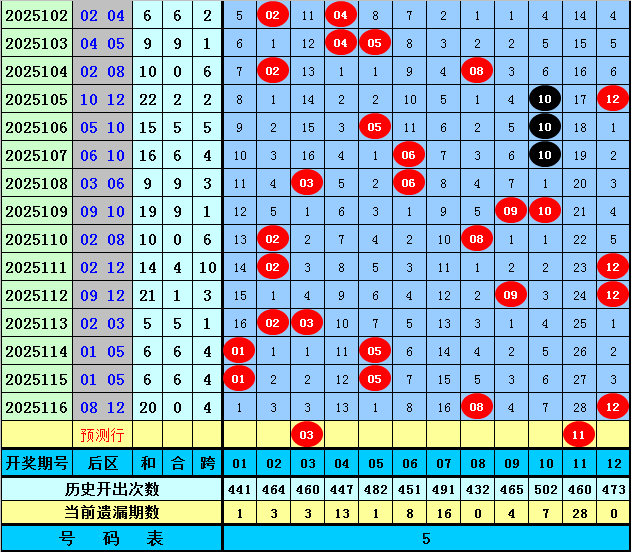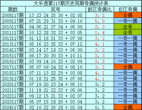 后区分析:在第117期历史同期开奖中,后区奖号奇偶比为16:18,最近5年同期后区奇偶走势为:一奇一偶、一奇一偶、一奇一偶、一奇一偶、全偶,今年同期看好奇数号码大热,参考号码03、11。