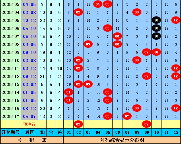后区分析:在第118期历史同期开奖中,和值大小为8:9,跨度奇偶比为7:10,本期后区注意两码02和09。
