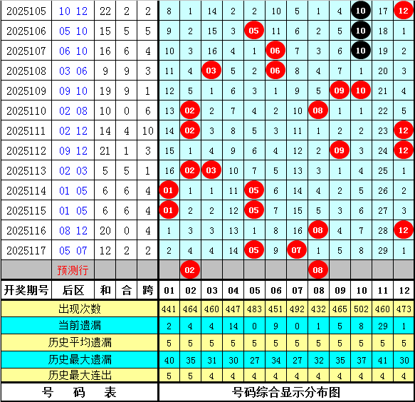 上期回顾:体彩大乐透第2025117期开出号码:05 10 18 21 29 + 05 07,其中前区奖号尾数奇偶比为3:2,大小比为3:2,012路比为2:1:2,大中小比为2:1:2,后区奖号尾数奇偶比为2:0,大小比为2:0。