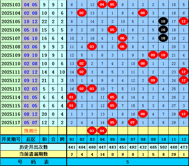 后区第二位推荐:在连续5期开奖中分别出号:03、05、05、12、07,均值为6.4,其中偶数奖号出现较少,本期适当关注偶数号码回补,参考号码04。