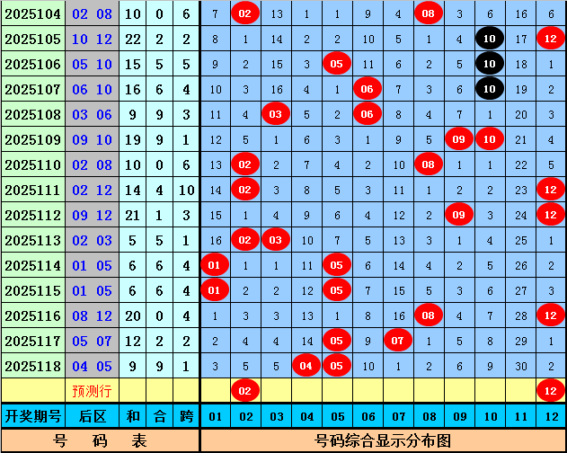 后区分析:上期开出后区奖号04+05,为一奇一偶组合,后区最近10期全奇、全偶和一奇一偶组合分别开出3次、3次和4次,本期后区注意全偶组合,关注号码02、12。
