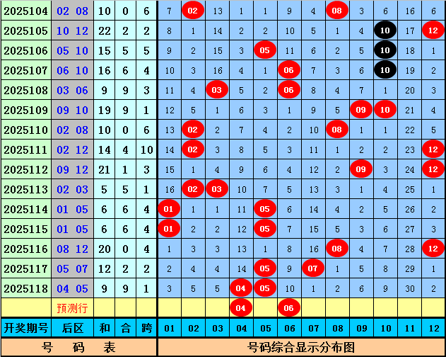 后区号码分析:在第119期历史同期开奖中奖,奖号02 11出现4次,奖号04 06 08 09 10 12出现3次,奖号01 03 05 07出现2次。本期后区五码参考01、04、05、06、10。