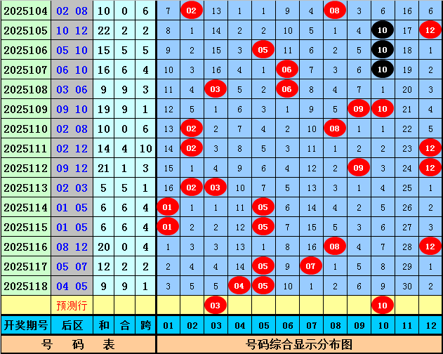 前区尾数012路分析:上期前区尾数012路比为1:1:3,前10期奖号尾数012路个数比为18:14:18,1路奖号开出最少,轮空期数分别为1期、2期和1期,本期看好奖号尾数012路走势相当,关注尾数012路比2:1:2。