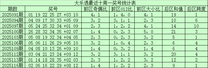 前区奇偶走势:上期前区奇偶比为2:3,上周一前区奇偶比1:4,最近十周一偶数号码略占优势,本期预计偶数号码再次走热,参考奇偶比2:3。