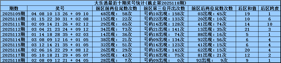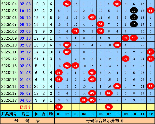后区奖号分析:上期后区开出奖号04+05,奖号和值为9,跨度为1,本期预计后区和值转小,关注两码01 07。