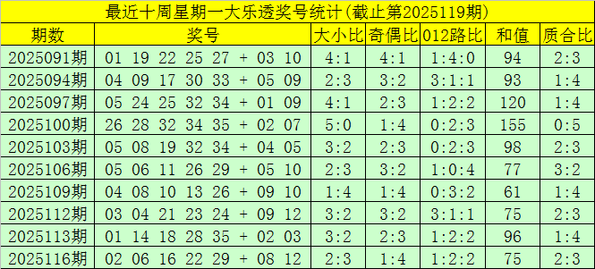 其中,号码奇偶比为5:7,偶数号码相对较热,012路比为2:3:7,2路号码相对较热,质合比为2:10;