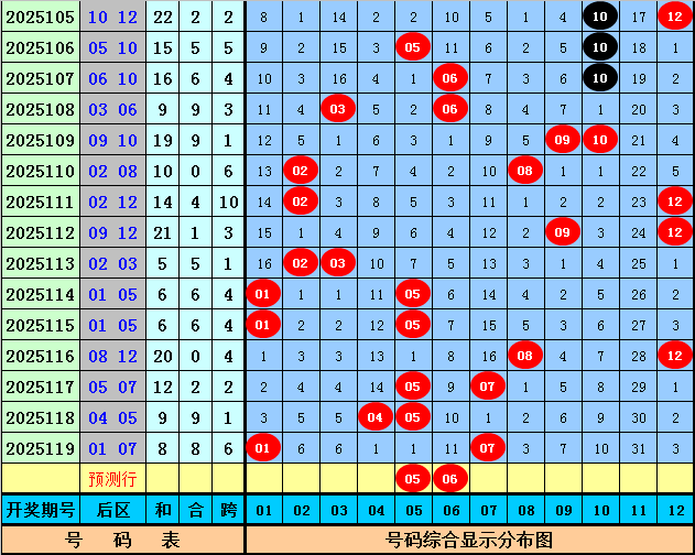 后区分析:在第120期历史同期开奖中,和值大小为8:9,跨度奇偶比为9:8,本期后区注意两码05和06。