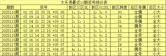 大乐透第2025119期奖号开出:08 15 27 29 31 +01 07。其中前区三区比为1:1:3,012路比为2:1:2,后区开出一大一小、全奇奖号。