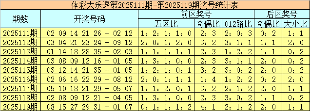 体彩大乐透第2025119期奖号为08 15 27 29 31 + 01 07,前区号码五区比为0:1:1:1:2,奇偶比为4:1,012路比为2:1:2,后区号码奇偶比为2:0,大小比为1:1。