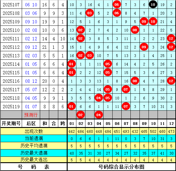 石浩第2025120期大乐透后区分析:后区上周星期三后区奖号为05和07,上期开出奖号01和07,最近9周星期三与最近9期后区奖号奇偶比分别为7:11和11:7,大小比分别为10:8和7:11,本期看好后区出现全偶组合,关注号码02、04、08、10。
