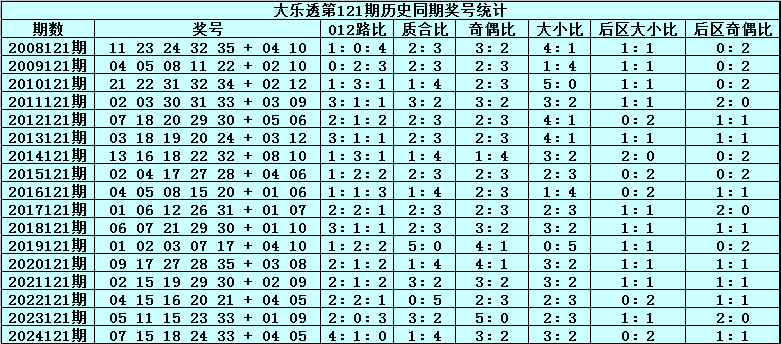 体彩大乐透第2025121期历史同期开奖号码分析: