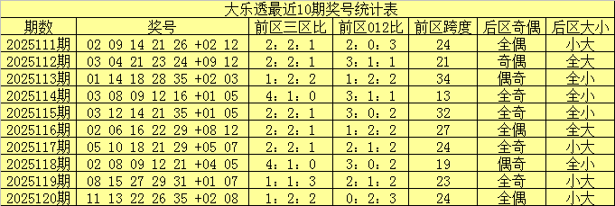 大乐透第2025120期奖号开出:11 13 22 26 35 +02 08。其中前区三区比为1:2:2,012路比为0:2:3,后区开出一大一小、全偶奖号。