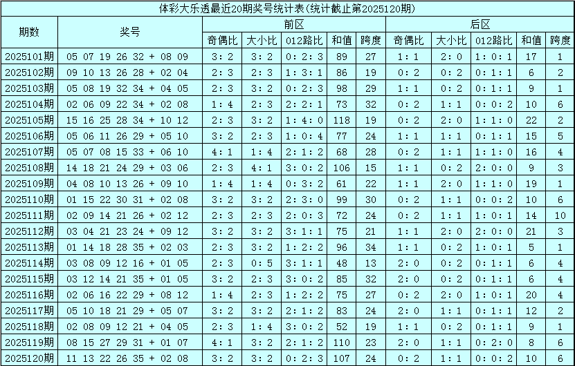 其中前区奖号奇偶比为48:52,大小比为46:54,012比为32:30:38,跨度出现范围在13-34区段,和值出现范围在48-118区间。
