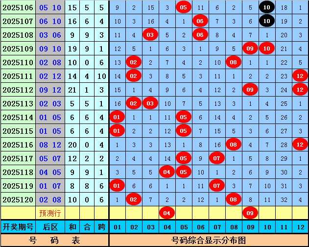 其中后区奖号奇偶比为16:24,大小比为18:22,012比为11:12:17,跨度开出范围在1-10区段,和值开出范围在5-22区间。