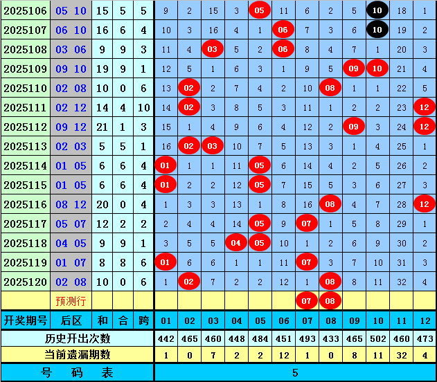 后区分析:上期后区奖号为02和08,最近5期后区和值分别为20、12、9、8、10,后区跨度分布范围在1-6,本期后区注意两码07、08。