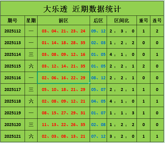 大乐透上期开出奖号:02 03 08 13 21+07 12,区间比是3 : 2 : 0,开出连号02 03,开出重号13。