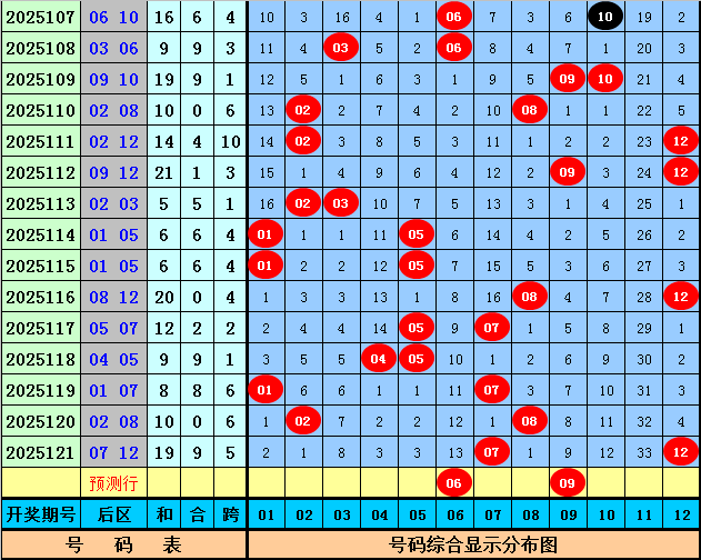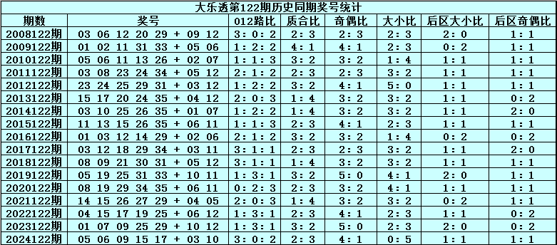 后区号码分析:第122期历史同期开奖中,后区两码全大开出3次,全小开出3次,一大一小开出11次,本期后区预计出现一大一小奖号,参考号码03、06、09、12。