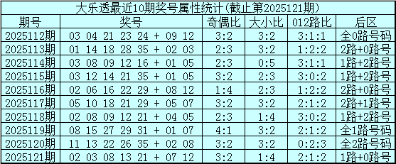 大乐透第2025121期开奖号码:02 03 08 13 21 + 07 12。前区奖号大小比为1:4,奇偶比为3:2,012路比为2:1:2,后区为1路+0路号。