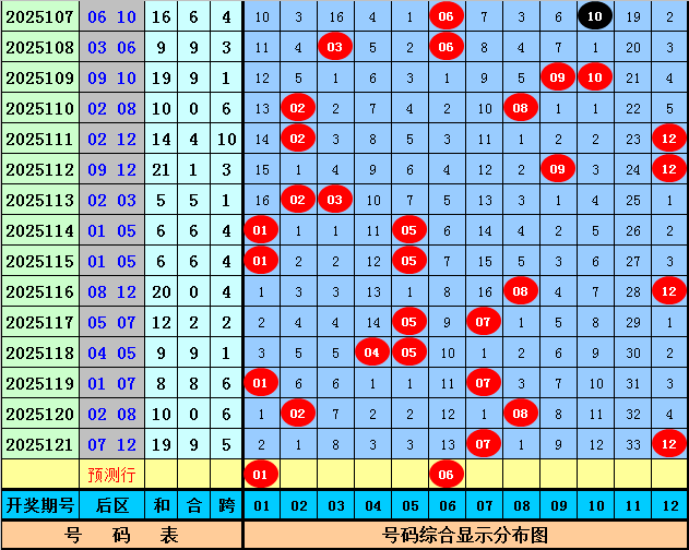 后区分析:上期开出后区奖号07+12,为一奇一偶组合,后区最近10期全奇、全偶和一奇一偶组合分别开出4次、2次和4次,本期后区防一奇一偶组合再出,参考号码01、06。