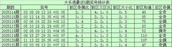 前区奇偶走势:上期前区奖号奇偶比为3:2,近8期前区奖号奇偶比为21:19,奇偶号码出现比例基本持平,本期看好奇数号码走热,预计奇偶比为5:0。