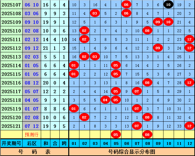 后区分析:上期后区开出号码07和12,最近10期后区奖号奇偶比为12:8,大小比为9:11,本期后区看好号码01、05、08、09、11,后区单挑两码05、08。