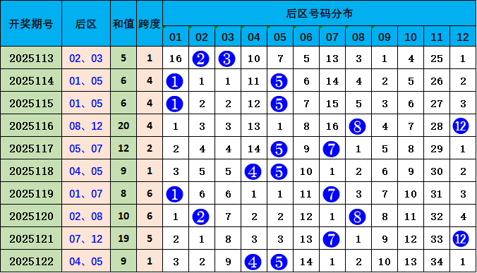 后区走势分析:上期开出04 05,开出和值9,较前一期和值下降10个点位,本期预测和值上升,参考号码04 08,和值12。
