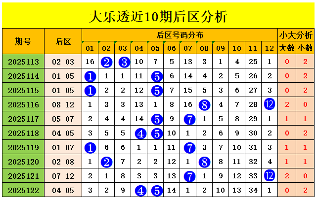 后区近10期大小比为7:13,小码奖号走势稍热,上期开出小小组合,近3期开出,小大、大大、小小、组合,本期后区推荐小大组合;