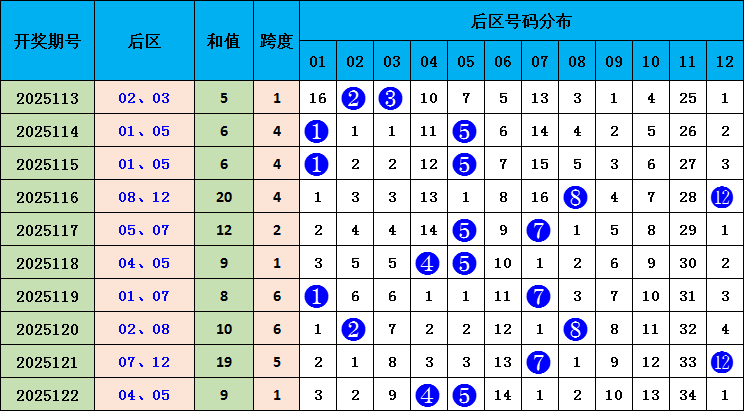上期后区奖号04 05,为小小、偶奇组合,最近5期后区号码奇偶比为5:5,大小比为4:6,。本期后区推荐小大、奇偶组合,推荐03 08。