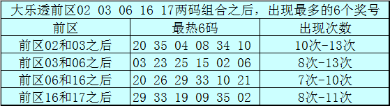 前区两码02和03和之后表现最热的6个号码为:20、35、04、08、34、10;