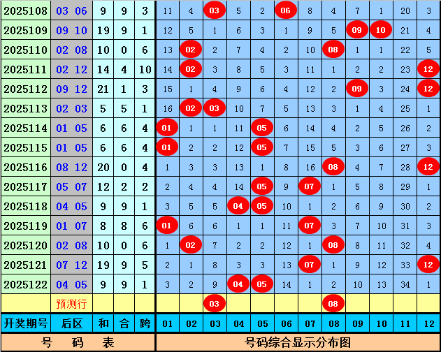 后区推荐:第123期历史同期后区奇偶比总比例为16:18,奇数走势较冷,本期注意回补,关注一奇一偶组合,两码参考03、08。