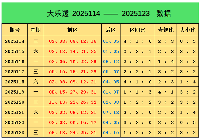 上期回顾:大乐透第2025123期奖号为:前区08、13、24、25、31,后区04、10,前区奖号三区比为1:2:2,奇偶比为3:2,大小比为3:2,后区开出小小组合04、10