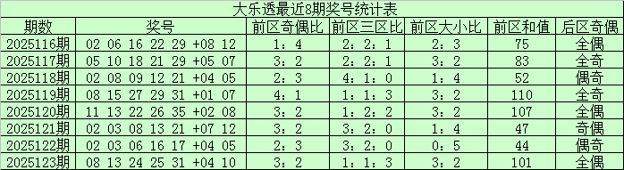 前区奇偶走势:上期前区奖号奇偶比为3:2,近8期前区奖号奇偶比为21:19,奇偶号码出现比例基本持平,本期注意偶数号码热出,看好奇偶比2:3。